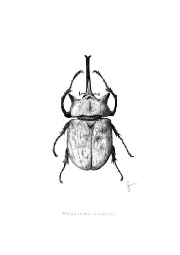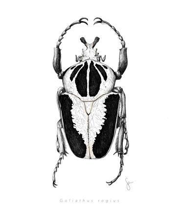 This illustration is the study of the beetle Goliathus regius. It is a species that lives mostly in the African jungles. An adult goliat beetle measures 6 to 12 cms in length, they are so large that when they fly they produce a sound similar to that of a helicopter.